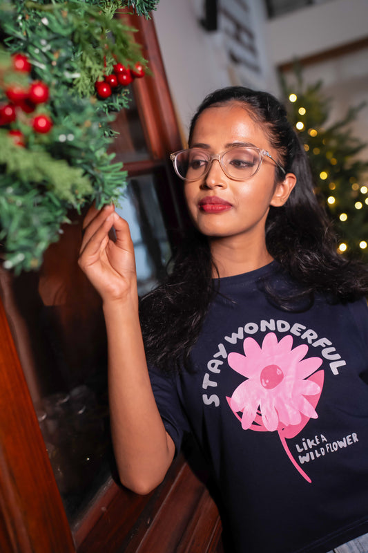 Black Crop Top with Big Pink Flower Print and “Stay Wonderful Like a Wild Flower” Quote